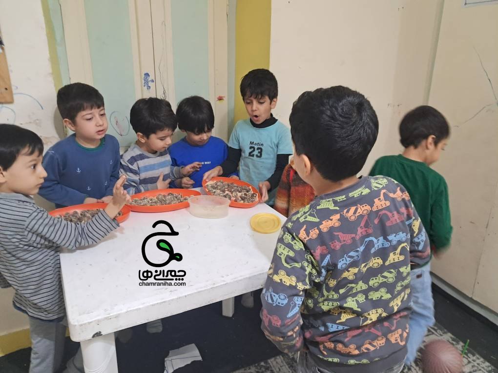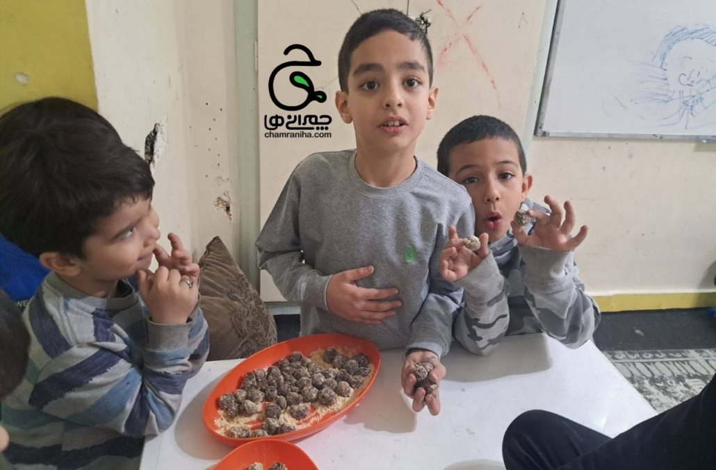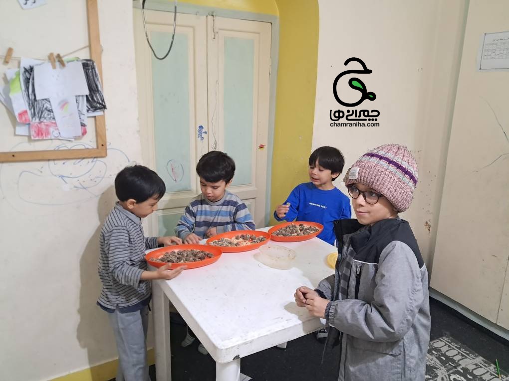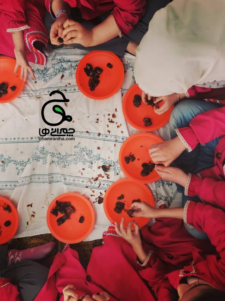 بعد از بیرون آوردن هستهها، خرماها آمادهی پر شدن هستند. در این مرحله، داخل هر خرما یک تکه گردو میگذاریم و بهآرامی خرما را میبندیم تا مواد داخل آن ثابت بماند. این بخش از کار برای کودکان بسیار جذاب است و میتواند با کمی قصه و گفتوگو همراه شود.