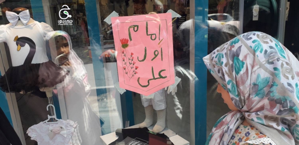 روی کاغذ های شطرنجی عبارت «یا علی» را مینویسند. بعد با قیچی این نوشته را میبُرند. سپس این نوشته را روی یک تخته گل میاندازند و دور نوشته را با چاقوی یک بار مصرف در میآورند.