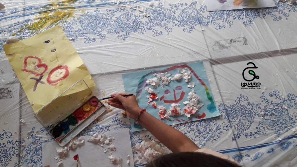وقتی چسب خشک شد، بچه‌ها می‌توانند با قلم‌مو و رنگ شروع به رنگ‌آمیزی کنند. بهتر است رنگ‌ها شاد و متنوع باشند تا کار زیباتر شود.