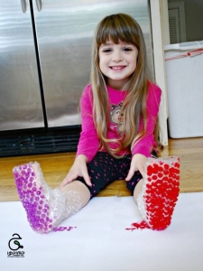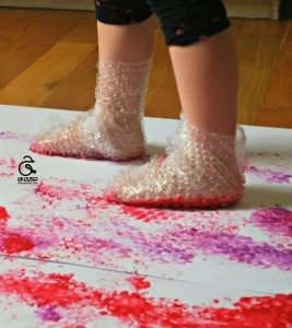 ابتدا به کمک چسب نایلون حبابی را زیر پای کودک می چسبانیم. بعد کودک پایش را در سطل گواش فرو می کند و روی کاغذ می گذارد. وقتی راه برود می تواند رد پاهای دایره اش را ببیند.